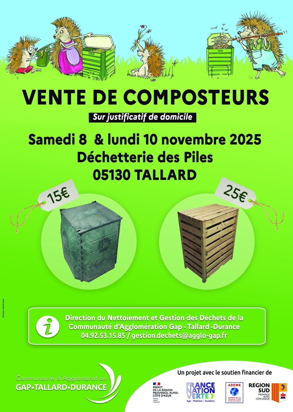 La Communauté d'Agglomération sera présente à la déchetterie des Piles à Tallard (au niveau du rond-point A51) pour vous proposer des composteurs individuels sur présentation d'un justificatif de domicile de moins de 6 mois :