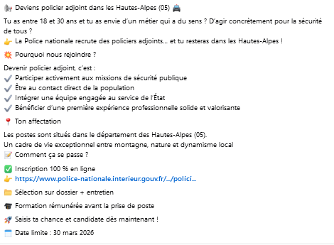 La police nationale organise un recrutement d'une dizaine de postes de policiers adjoints, qui seront spécifiquement affectés dans notre département. Ce recrutement, ouvert aux jeunes gens âgés de 18 à 30 ans, et se clôturera le 30 mars prochain.