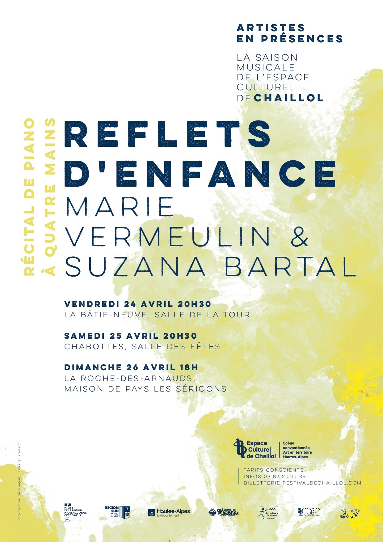 Marie Vermeulin et Suzana Bartal sont deux pianistes marquantes de leur génération, musiciennes aux carrières solides que les salles les plus prestigieuses se disputent, en Europe et dans le monde. Pour ces concerts, elles se partagent le clavier pour donner un programme de musique française à quatre mains. Au cœur de ce vaste et foisonnant répertoire, elles ont dessiné une promenade pleine de charme qui exhale les parfums de l’enfance. Ma Mère l’Oye de Maurice Ravel, inspiré des contes de Perrault, à l’écriture simple et dépouillée, les Jeux d’Enfants de Georges Bizet, qui recèle des trésors d’invention et de malice, mais aussi Memories de Florentine Mulsant, commande que l’Espace Culturel de Chaillol lui a passée pour les deux pianistes. Un récital pour les oreilles des plus jeunes auditeurs et pour tous ceux qui ont gardé en eux la mémoire des joies de l’enfance.